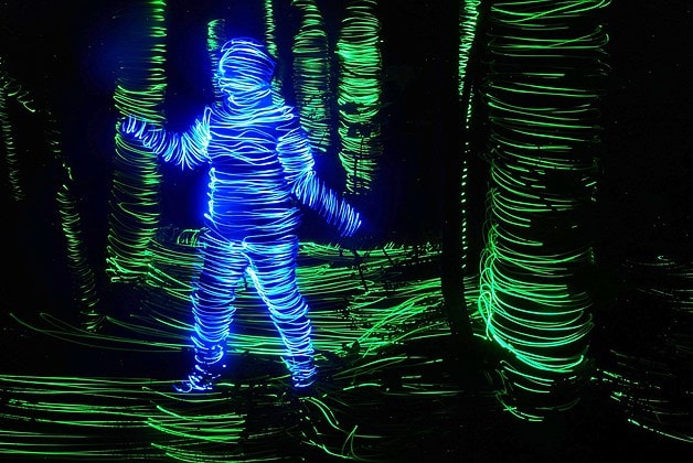 March 11, 2014: Cocooned in neon waves of light, these mummified figures are part of a light painting series by Finnish artist Janne Parviainen. Parviainen, 33, created the futuristic images by wrapping himself from head to toe with a tube of LED lights & using a long exposure camera to trace his body for the cosmic effect. Exposure time can last several minutes, depending on the size of the subject he is tracing. “In my pictures you see a parallel universe which only the camera can capture,” Parviainen said.