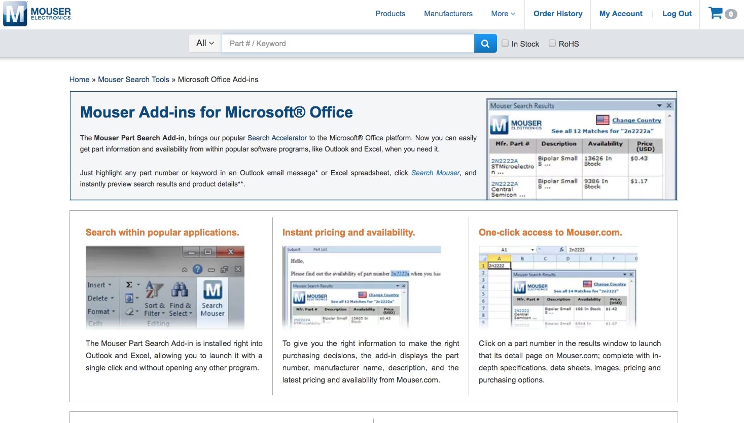 Figure 2: Mouser’s Microsoft Office Part-Search Add-in feature is launchable with a single click and without opening any other program. (Source: Mouser.com)