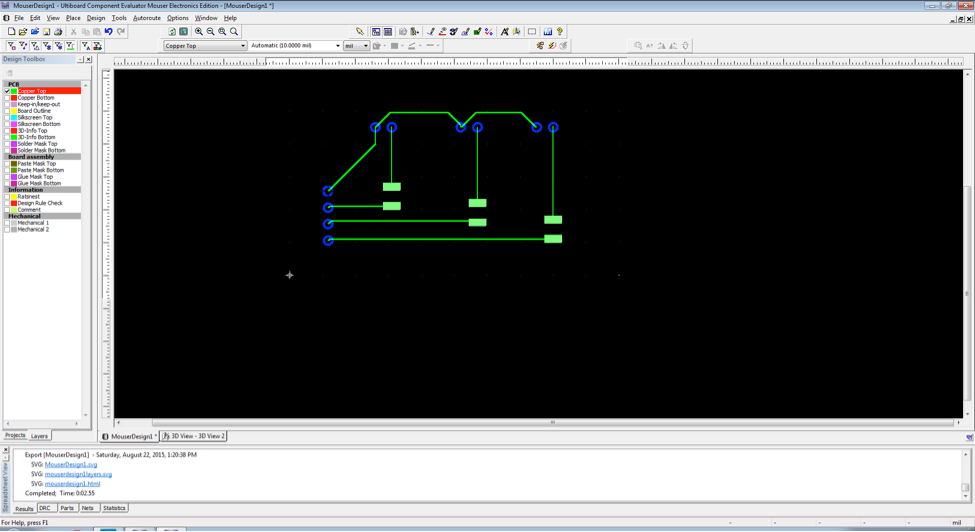 2.     Use the “Follow Me” tool to route your traces. First make sure you are on the top copper layer and then select a component pad.  Next use the shortcut ‘Ctrl-T’ to begin routing. Ultiboard will give you some guidance on where to route but ultimately the choice is yours. I run the DRC and ERC after every trace just to be safe.