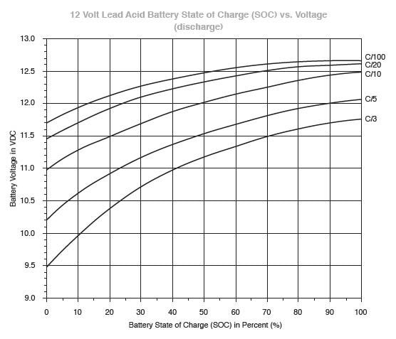 Figure 2. Battery voltage vs. state of charge, under a range of discharge rates (Source: scubaengineer.com)