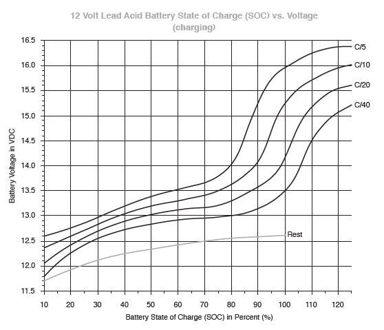 Figure 3. Battery voltage vs. state of charge, for a range of charging rates