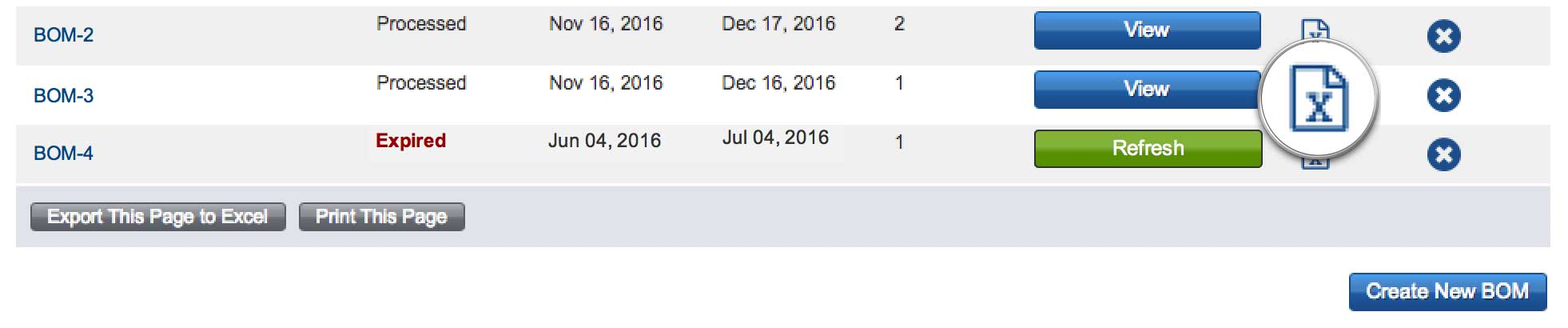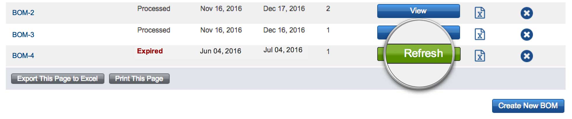 After 30 days, the pricing that was quoted for your BOM will expire and must be updated. Select the “Refresh” button for any expired BOM to re-process the data and get a new pricing quote.