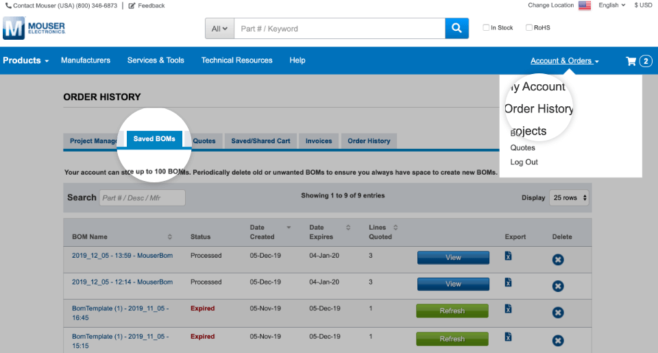 All BOMs associated with your account can be found within the Order History tools of your My Mouser account. Saved BOMs is the one place to go to view and manage all aspects of your saved BOMs. Here, you have access to the following functionality: - View a current BOM
